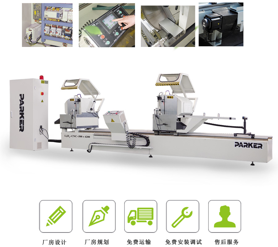 本機是為適應(yīng)我國鋁、塑門窗加工業(yè)的發(fā)展而開發(fā)的機型。該機主要用于鋁門窗、幕墻型材的加工。本機安裝進口數(shù)顯表,長度尺寸一目了然。數(shù)顯表顯示精度高,可精確到小數(shù)點后兩位。本機操作簡單、性能可靠,技術(shù)先進、易于維護保養(yǎng)。刀具使用硬質(zhì)合金齒鋸片,切削速度高、生產(chǎn)率高、加工精度高。兩鋸頭既可單獨工作,也可同時工作。同時工作時,能一次切出所需要的長度及型材兩端角度。