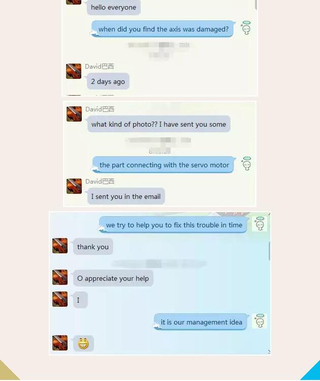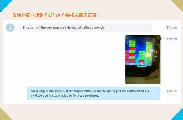 印度客戶,于2013年從派克購買數控清角機。近日,由于新員工誤操作,導致設備運行出現問題。客戶從印度那邊發過來求助信息,海外事業部的業務員通過Skype與該客戶取得聯系,進一步了解設備故障出現的原因,故障出現時呈現的狀態等,再與技術工程師溝通交流,了解可能導致的原因以及用對措施,通過圖片、視頻,在線視頻等途徑進行跨國通話,最終發現問題出現在數控系統之中。于是,技術部和售后服務部齊心協力將解決方案以圖片以及視頻的方式多元素,多途徑展示給客戶,指導客戶如何編程,并編寫一套代碼數據發送過去,最終該清角機一切數據恢復正常,六把刀又重新正常流利工作(客戶與海外事業部業務員部分聊天記錄)